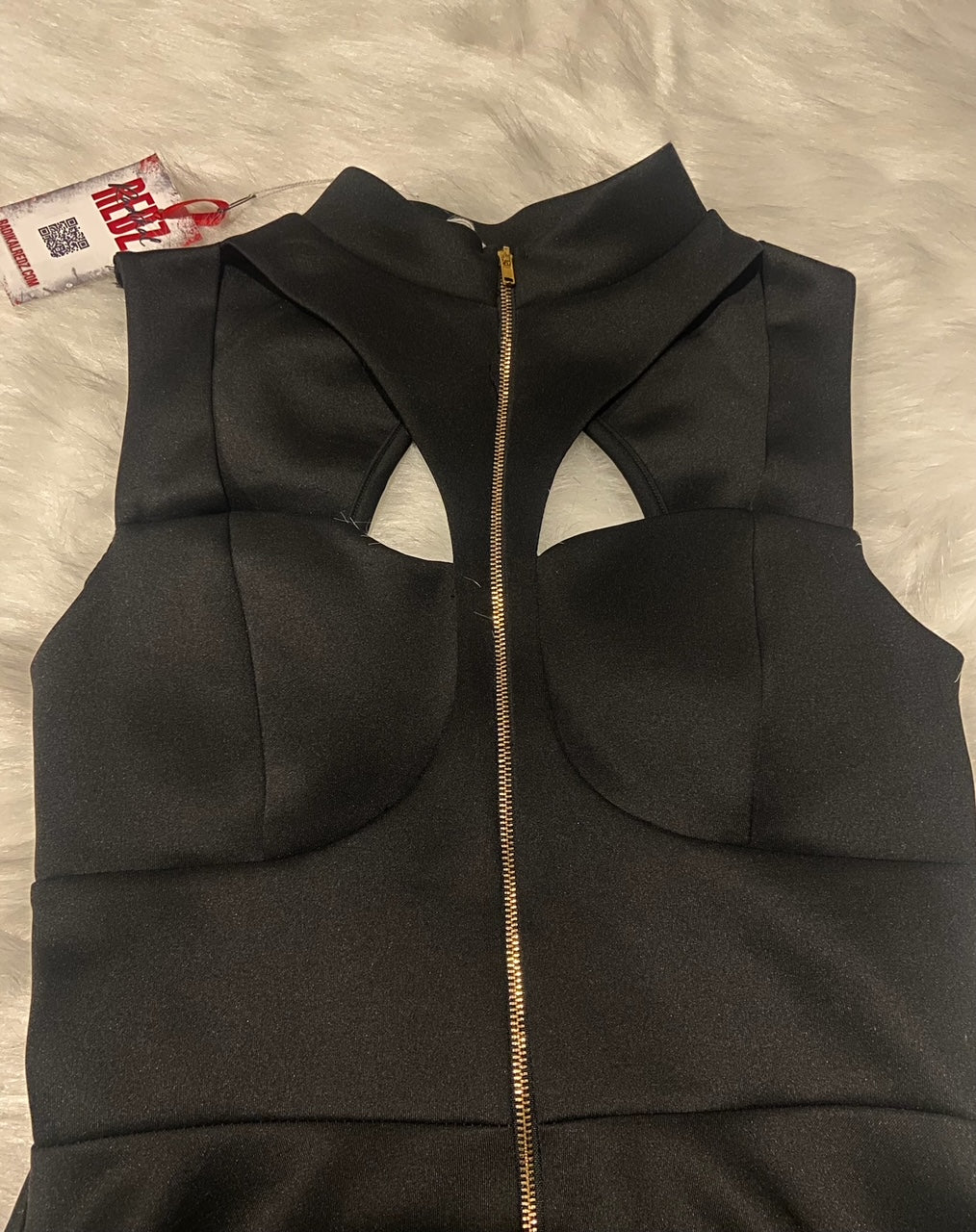 Black High-Neck Cutout Peplum Top with Gold Zip
