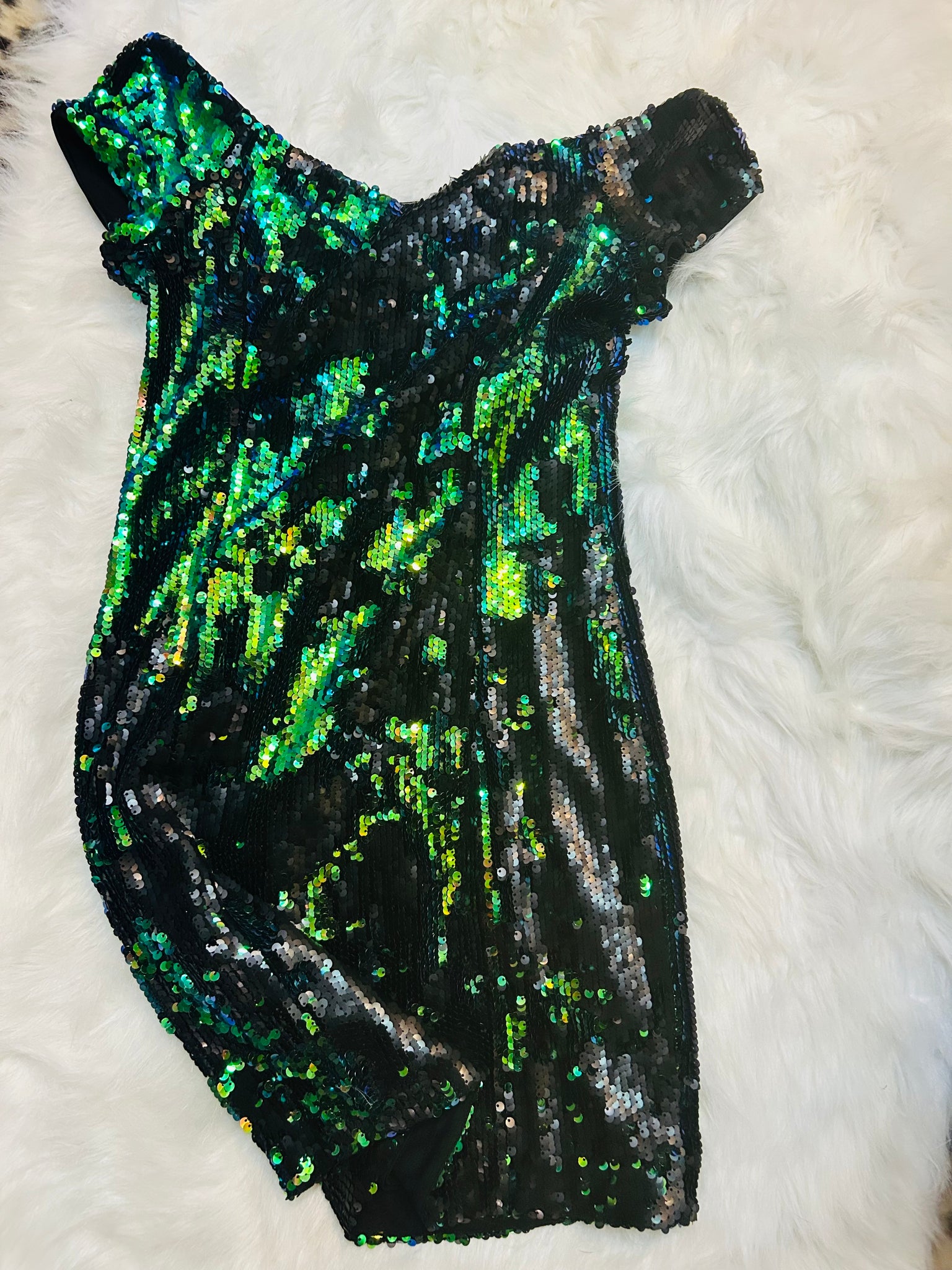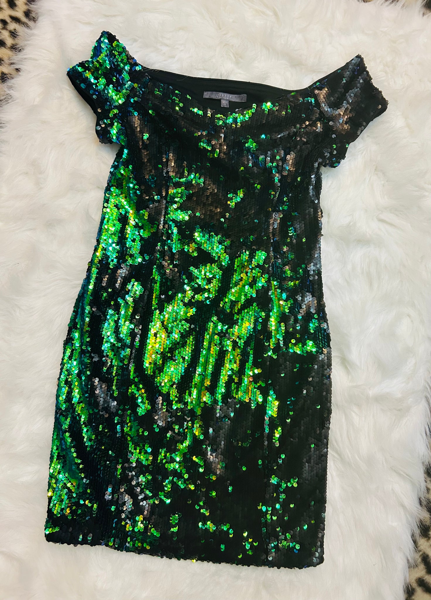 Make an entrance this season. This stunning Guess holiday dress is a show-stopper featuring radiant emerald toned sequins that catch the light beautifully from every angle. Designed in a sleek body -skimming silhouette, it highlights your curves while offering comfortable stretch for movement (and dancing).