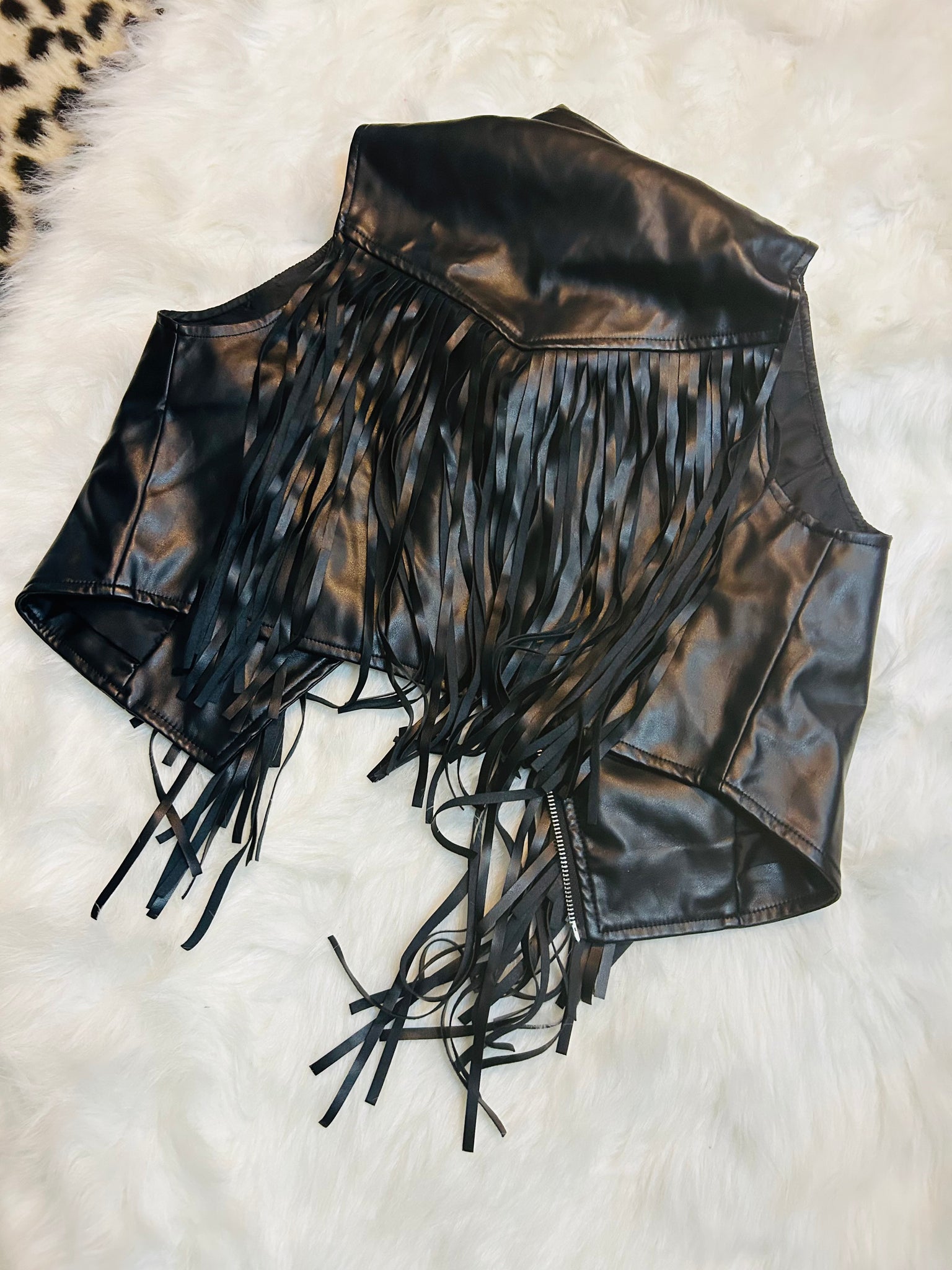 Turn up the edge with this statement-making Le Lis Black Pleather Fringe Vest. Crafted from sleek faux leather, this cropped moto-inspired vest brings instant attitude to any outfit. Long, flowing fringe along the front and back adds bold movement — perfect for concerts, festivals, or adding a rockstar twist to your everyday style.